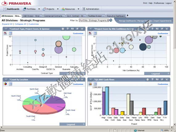 度管理。1999年推出了企業級專案管理(EPM)軟體,簡稱P3E軟體。Primavera公司根據不同行業的特